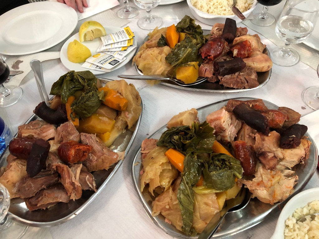 Furnas Cozida. The Cozida is made up of cabbage, sweet potatoes, carrots, kale, pork, chicken, beef, sausage and blood sausage – all cooked in the ground geothermically. We made the mistake of ordering TOO MUCH FOOD. Two orders, even one, would have been plenty,