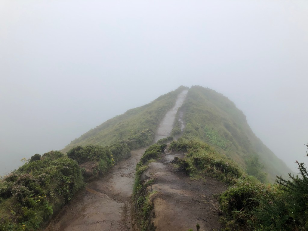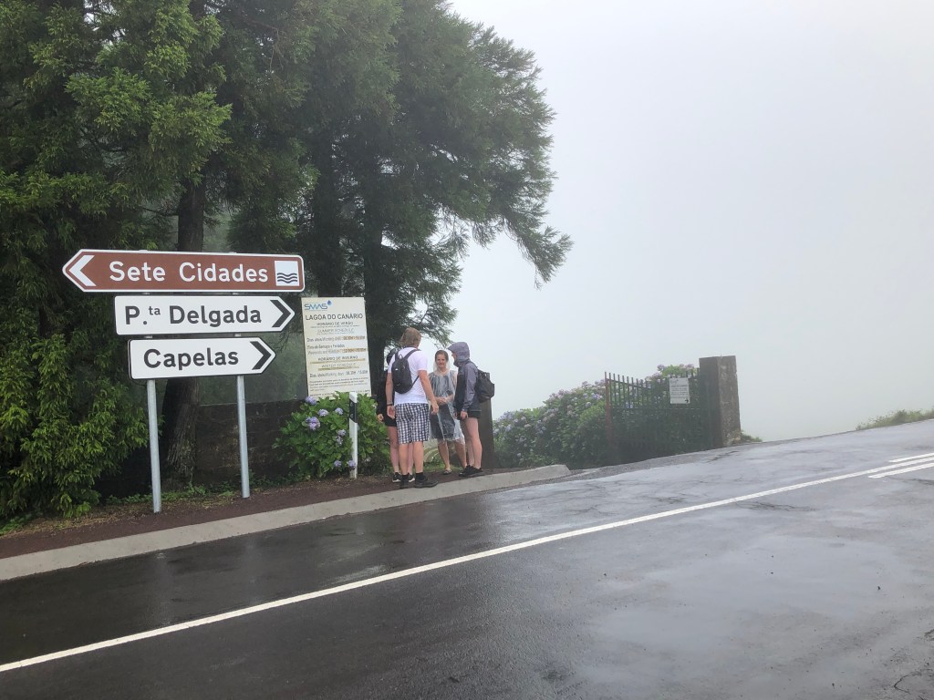 The first adventure of the day was just getting to Sete Cidades. The very helpful woman at the front desk basically told us to drive West from Fenais de Luz and when we got to a town called Santo Antonio, turn left at a red restaurant. OK. We did that and were soon climbing up narrow roads bordered by hydrangeas, volcanic rock walls, and mist! My goal was to find the place that you had to hike to to find that spot that everyone said had the perfect views.