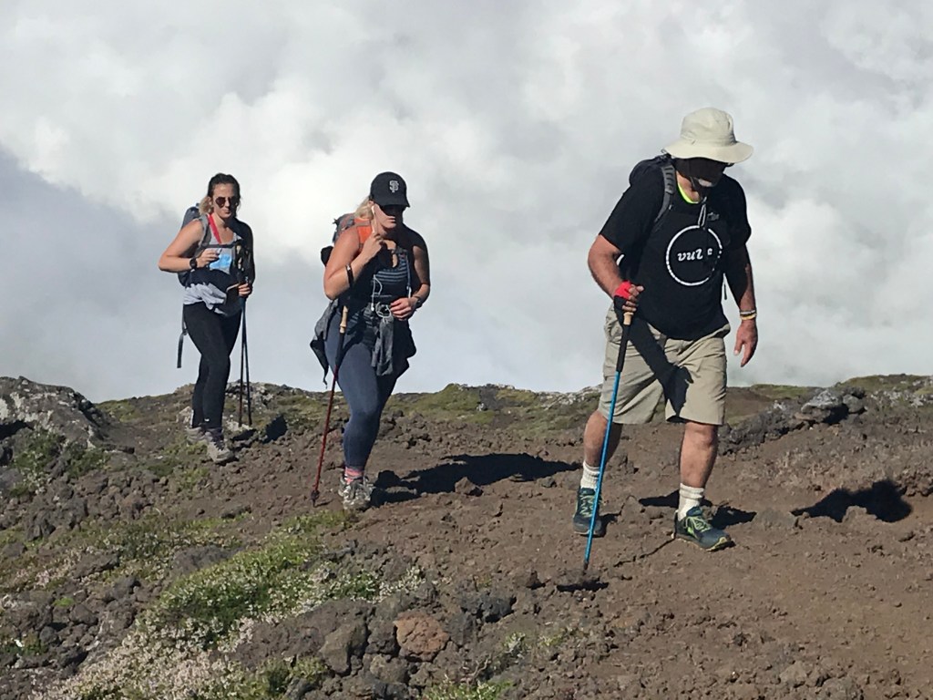 The Descent. You are thrilled to have made it to the top. But don’t forget there is a 4+ hour descent below you that may be even tougher than the climb up. On the descent you definitely need two poles for stability when the trail gets covered with loose gravel. Nuno instructed us not to put out hands into the loops and they could get caught. Better to lose a pole than to break an arm.