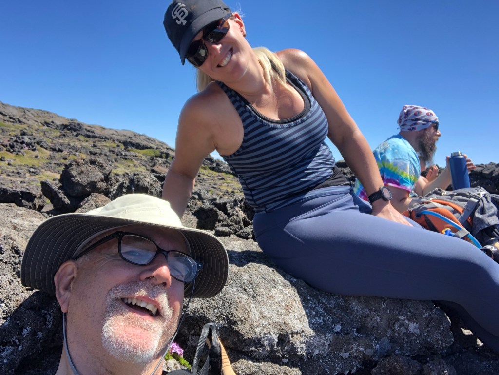 The truth of climbing Mt. Pico. I had seen the video and though it looked difficult every one seemed to be saying that if you are in AVERAGE shape you will be able to make the climb. The fact that I can ride hundreds of miles and had been working out on the stair climber at the gym told me that I was in that kind of average shape. SHOES.I also had prepared by going to REI to find the perfect pair of hiking shoes. In the end I decided on a pair that were more like stiff running flats than heavy duty hiking boots. BIG MISTAKE, To make this hike you need to have off trail kings of books with a stiff Vibram-type sole. You will need grip and you need the stiffness of a over the ankle boot. STICKS. They also said that it would be a good idea to have sticks. I wasn’t sure that was true because I thought only old people who were afraid of falling really needed poles. How wrong I was. On this hike you definitely need them. If you are used to them, both are needed going up, but if you have never used them you need at least one. And going back down you definitely need two. WATER. You need as much water as you can carry – at least two big 1.5 liter bottles per person. FOOD. You need to think of this as a century bike ride or a marathon. Bring energy bars, blocks, goo – whatever works best for you. You need to be prepared so you will not BONK!