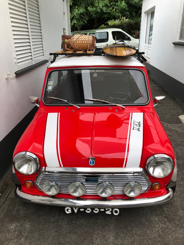 Coffee plantation and the Nunes Faja. Dina’s family lives on the Nunes Faja and grows coffee. The only place coffee is grown in Europe. We saw the coffee plants and hears how they roast the coffee in cast iron skillets. Then we got to taste it in their cafe. WE also go to see Dina;s mothers loom, rugs, and other handicrafts. The Mini Cooper was once owned by the father of the family. They found it again years later and restored it back to its glory.