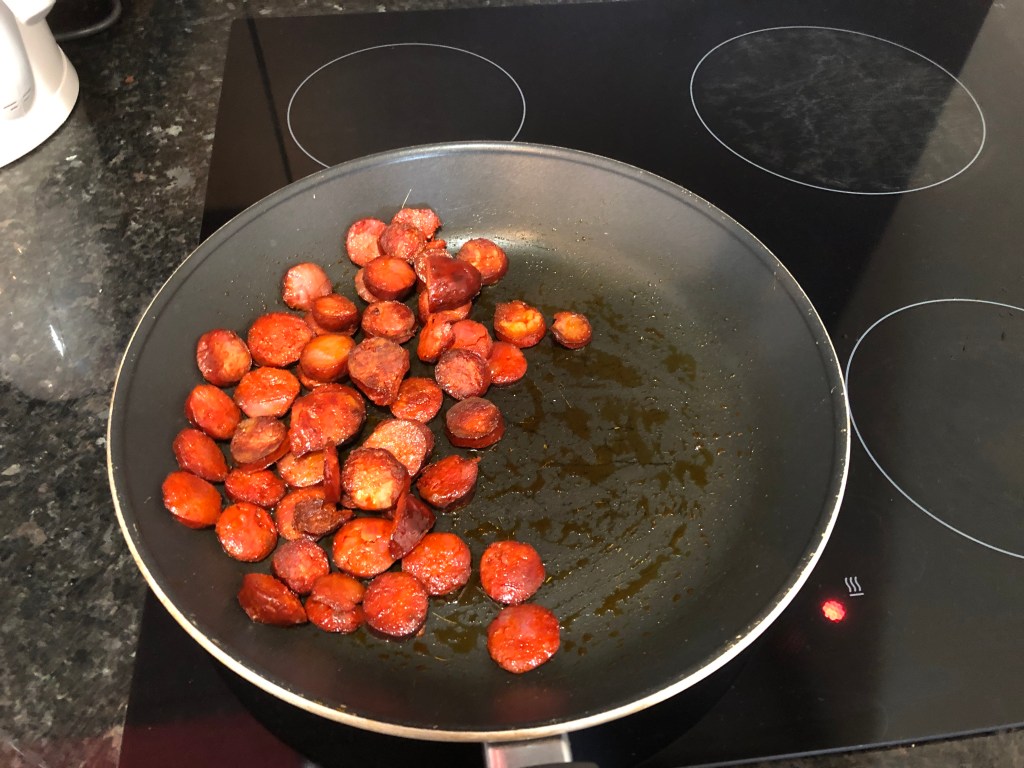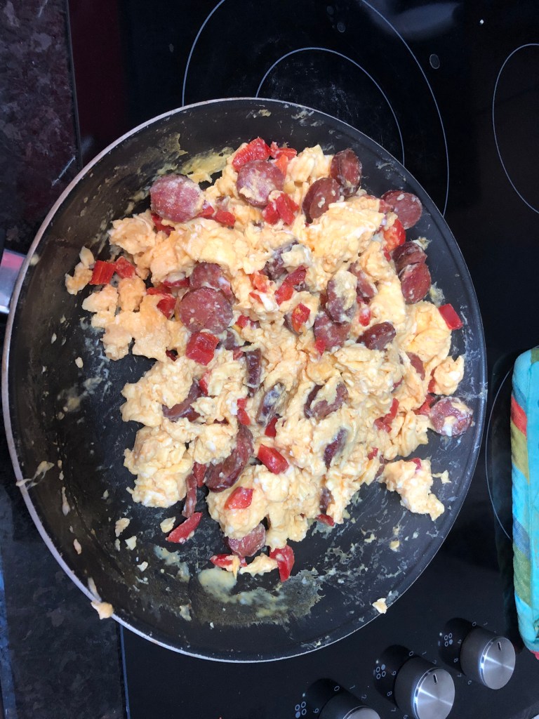 Linguica and eggs. About the only part of Portuguese heritage that I remember growing up is that once in a while my dad would make linguica and scrambled eggs. Linguica is a dry Portuguese sausage. I though it would fun to walk to the store, buy the ingredients , and make the dish for the gang. Made me happy to try and channel my dad. When you get to this age, you start to realize how little you actually knew about your parents.