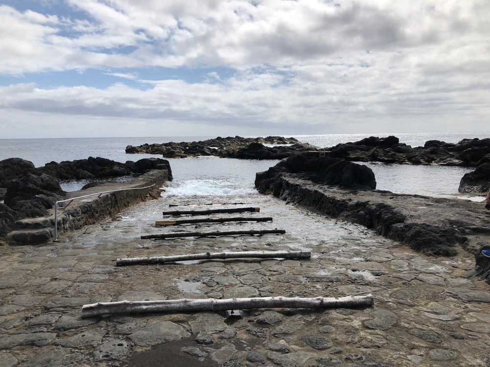 First accommodations – Pedras do Mar. I took a recommendation from one of the Pinterest sites (Travel Geek) and booked a place on the north side of the island opposite from Ponta Garda at a resort called Pedras do Mar in the town of Fenais da Luz. This turned out to be a great choice as it was a great hotel with a restaurant, pool, steam room, sauna, a killer breakfast and easy access to great ocean views. After we picked up the car, it took us a little more than half an hour to get there. The two things we noticed. Volcanic rock walls and hydrangea bushes. Everywhere.